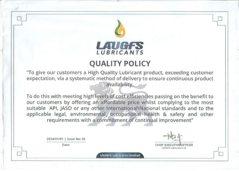 To give our customers a High-Quality Lubricant product, exceeding customer expectation, via a systematic method of delivery to ensure continuous product availability. To do this with meeting high levels of cost efficiencies passing on the benefit to our customers by offering an affordable price whilst complying to the most suitable API, JASSO or any other International\National standards and to the applicable legal, environmental, occupational health & safety and other requirements with a commitment of continual improvement
